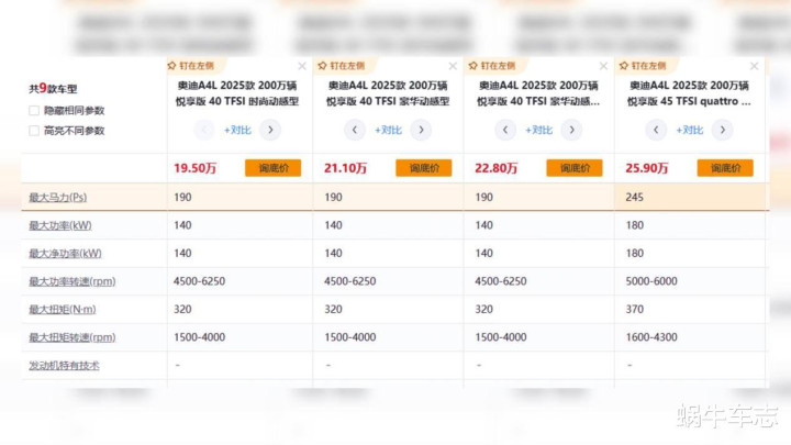 奥迪A4L的价格近期一直在缓慢下滑,入门款裸车价都已经掉进了20万内,这其实是正常的。毕竟作为继任车型的A5L的官方指导价都才25.58万,更别说还有一堆上市优惠和补贴,让它实际价格来到了23.98万起。新款的价格都这样了,老款自然也买不上高价,所以很多人看到20万出头能拿下A4L都很心动。我们知道,现款奥迪A4L,也就是2月份上市的2025款悦享版一共有四款车型,价格配置和动力都不尽相同,我们该怎么选呢?